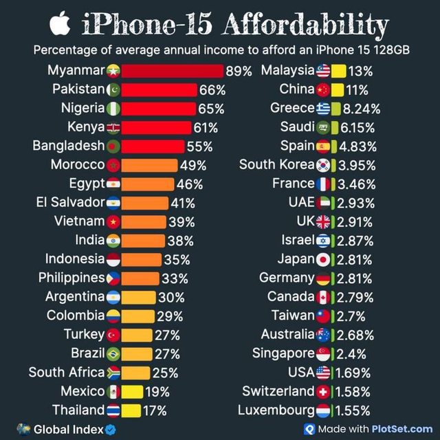 1.原文連結: https://ec.ltn.com.tw/article/breakingnews/4442009 2.原文標題: 花幾%年薪才買得起iPhone 15? 各國排行出爐! 3.原文來源: 自由時報 4.原文內容: 蘋果發表iPhone15系列手機,但在價格部分全面漲價,外國網站Global Index統計出各國人民需要花多少年薪才能買得起iPhone 15 128G。 Global Index針對各國需花1年薪水的多少百分比才買得起iPhone 15 128GB的調查指出,前3名分別為盧森堡(1.55%)、瑞士(1.58%)、美國(1.69%)皆僅需花1年不到2%的薪水便可入手新款iPhone 15 128G。 於本次統計調查中,台灣排名第6名,需掏出2.70%的年薪可以購買到iPhone 15 128G,日本(2.81%)排名第9、南韓(3.95%)排名第14、中國(11%)排名第18。 處於末段班的5個國家分別為緬甸(89%)、巴基斯坦(66%)、奈及利亞(65%)、肯亞(61%)、孟加拉(55%)。 https://i.imgur.com/FLBIjyR.jpg
