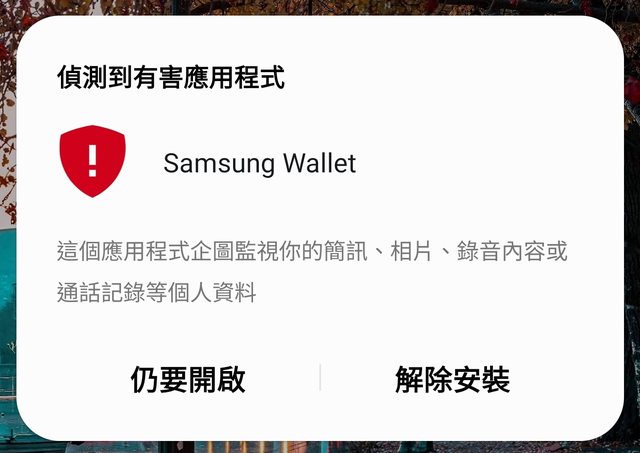 但我去app的設定看簡訊、錄音、相片那些權限都是拒絕的阿 然後我點Samsung wallet又跳出以下警告 https://i.imgur.com/chjfiMR.jpg