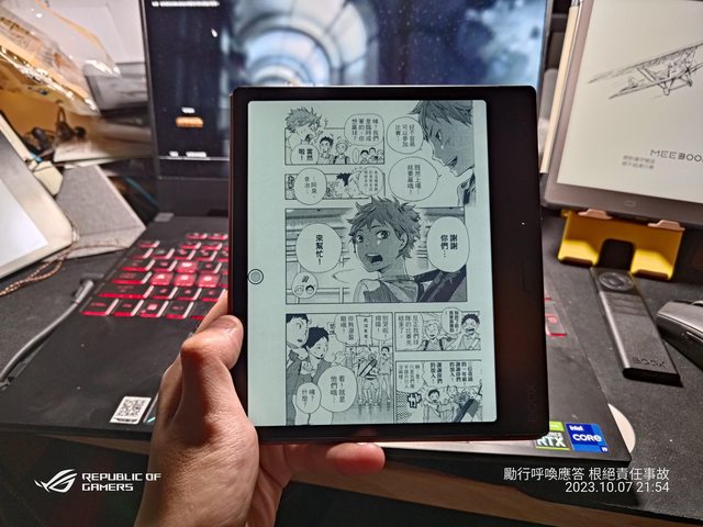 (Page,書籍:排球少年) 另外彩色機的部分,文石有BSR技術,所以殘影相比Hyread少許多(但還是有殘影) 漫畫7吋算是低標,6吋硬要看也是可以 7.8吋躺床上看很爽,10.3吋躺床上搭支架+翻頁器更爽 https://i.imgur.com/67p3rnx.jpg