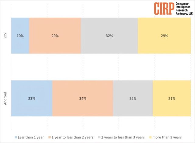 ────────────────────────────────────── 1.原文連結: https://www.ithome.com/0/727/675.htm 2.原文標題: 調查:你會使用 iPhone / 安卓手機多長時間才會換新機? 3.原文來源(媒體/作者): 來源:IT之家 作者:故淵 4.原文內容:請刊登完整全文(否則依板規刪除並水桶)。 IT之家 10 月 26 日消息,根據市場調查機構 CIRP 公佈的最新報告,在美國市場,iPhone 用戶的升級週期要超過大部分安卓用戶。 調查報告顯示,購買 iPhone 之後首年就升級的蘋果用戶占比只有 10%,而相比較而言,安 卓買家首年升級的比例達到了 23%。 61% 的蘋果用戶使用 iPhone 的時間超過 2 年,而安卓用戶使用 2 年以上的占比僅為 43% https://i.imgur.com/8c2vyo9.jpg