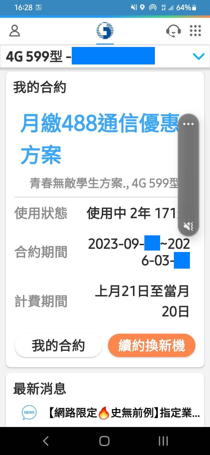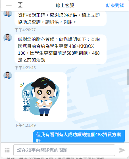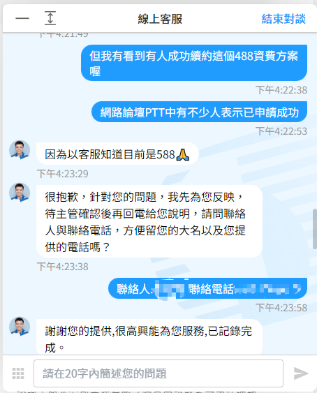 → DavidJam : 線上文字客服提問,說我朋友有成功續約4G 488不限速 11/01 16:24