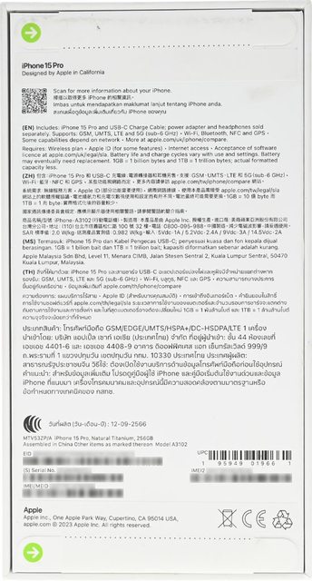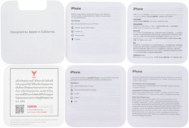 ▼外盒背面,有名稱、取得更多iPhone相關資訊QR碼連結、多國語言包裝內容/支援頻段/
