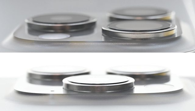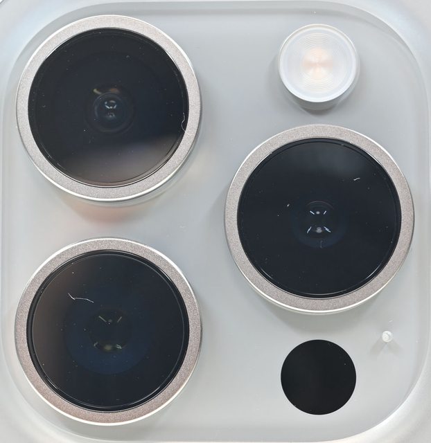 ▼銀色金屬圓形外框及外層藍寶石水晶玻璃保護鏡蓋住3個鏡頭(0.5×廣角/1×標準/3×