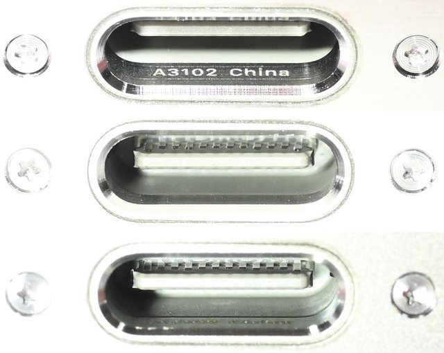 ▼USB-C連接埠近照,開口周圍有斜面,開口內側刻上A3102型號及產地(中國),內部