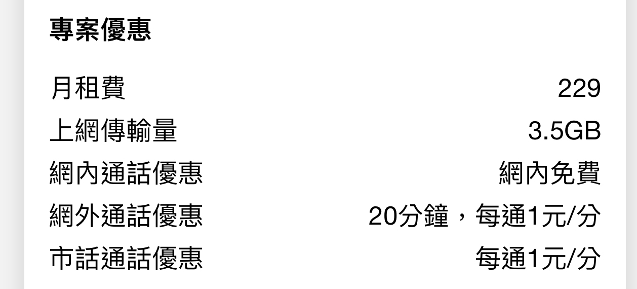 → allen0519 : 網路3.5G用完3m吃到飽 網內免費 網外市話都是每分鐘 11/18 01:24