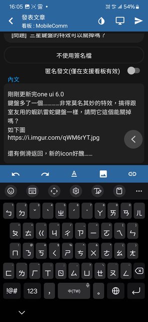 剛剛更新完one ui 6.0 鍵盤多了一個…………非常莫名其妙的特效,搞得跟室友用的蝦趴雷蛇鍵盤一樣,請問它這 個能關掉嗎? 如下圖 https://i.imgur.com/qWM6rYT.jpg