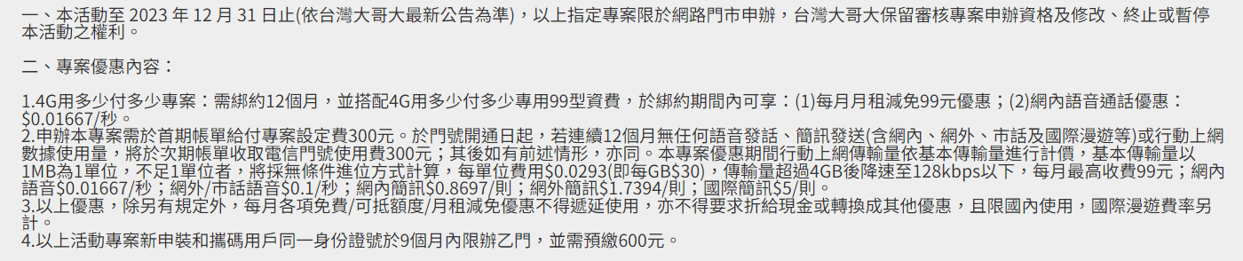 為應付公平會和通傳會合併後不可濫用其獨佔地位 並保障弱勢資費要求 台哥也表面的推出了用多少付多少 4G服務,每1GB流量30元,費用上限99元,收取設定費300及預繳金600 https://reurl.cc/NyWV7Q 看似不錯,but用文章的上下文來判斷 應該是表示這是一個99元的資費方案,綁約一年,第一年享有 1.每月99元的月租減免 2.網內費率以每秒0.01667元計費 在合約期滿後,可隨時換約或異動 若不換約,就不再招待每月99元...只有網內費率的折讓...,而99應該是不再減免 而且它也是有一年若無任何紀錄的300元呆戶費 由於目前還看不到合約的細節,網路門市也還未開辦,不過以富x企業的個性 應該不是終身,也不是4G終身,而是一年期付300元可減免一年月租的方案 給大家參考囉 -- ※ 發信站: 批踢踢實業坊(www.ptt.org.tw), 來自: 112.104.235.45 (臺灣) ※ 文章網址: https://www.ptt.org.tw/MobileComm/M.1701422285.A.49D
