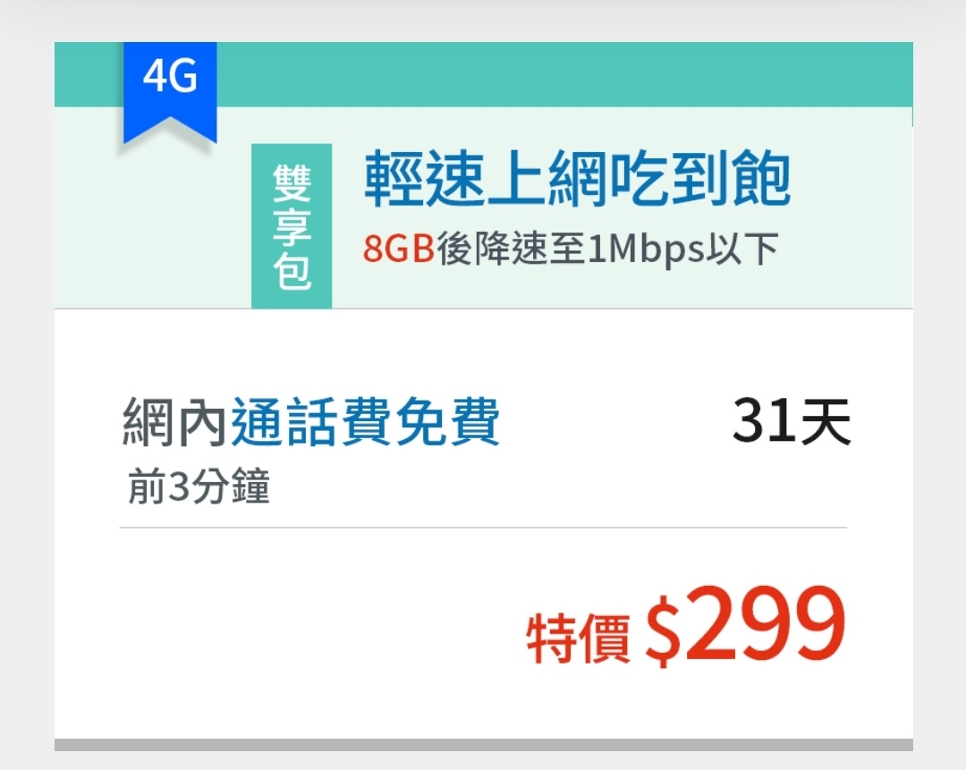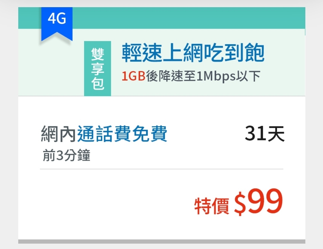 → Dwccc : 之前亞太99是3M吃到飽+4GB,網內免費 網外市話1元 12/06 19:55