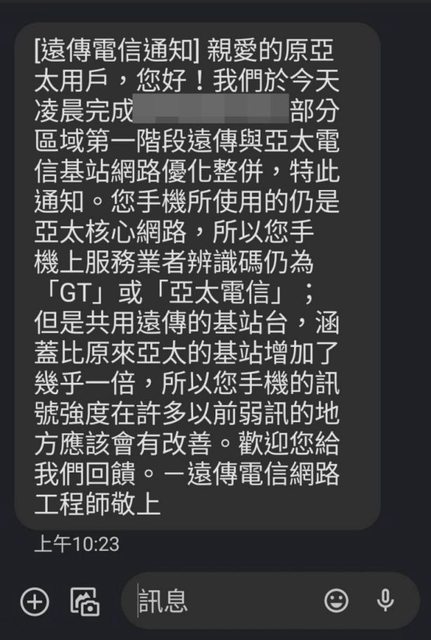 → ymx3xc : 這簡訊意思應該是該區域開放MOCN, 不用換SIM卡換約 01/04 18:41
