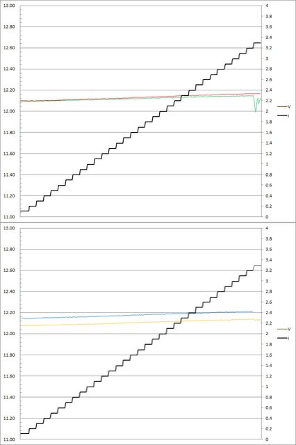 ▼C1(紅)/C2(綠)/C3(藍)/C4(黃)搭配5A線材的固定檔12V輸出負載測試,隨著電流增加,