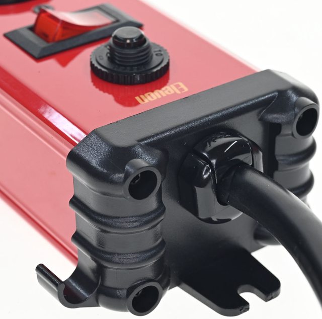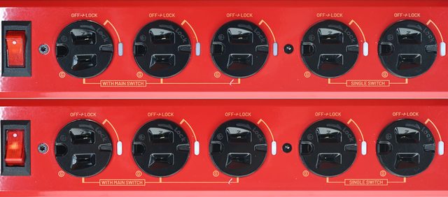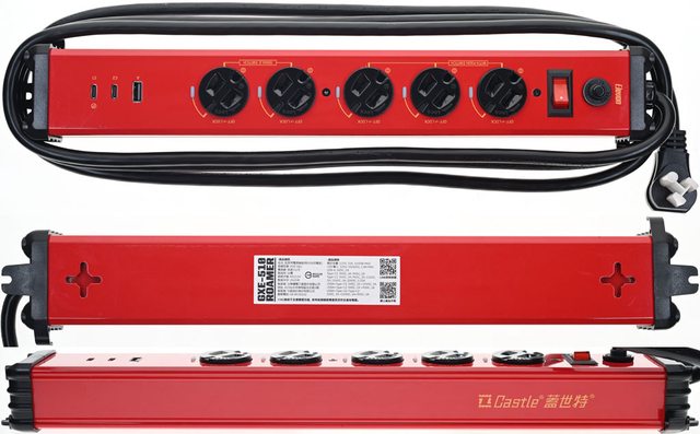 ▼延長線採用紅色亮面烤漆鋁合金外殼,正面有過載無熔絲開關、帶燈開關、5個旋轉插