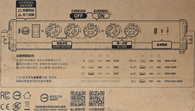 ▼外盒背面有延長線各部分說明、旋轉開關說明、注意事項、USB輸出埠功率分配(A+C2說