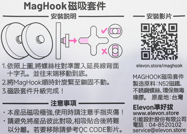 ▼MagHook磁吸套件安裝說明、注意事項(QR CODE英文誤植成QC CODE)、安裝影片QR碼、