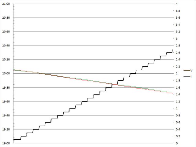 ▼充電器模式下USB-C1(紅)/USB-C2(綠)的固定檔20V輸出負載測試,隨著電流增加,輸出