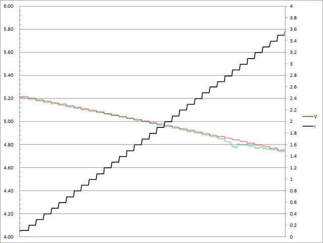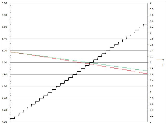 ▼充電器模式下USB-C1(紅)/USB-C2(綠)的固定檔5V輸出負載測試,隨著電流增加,輸出