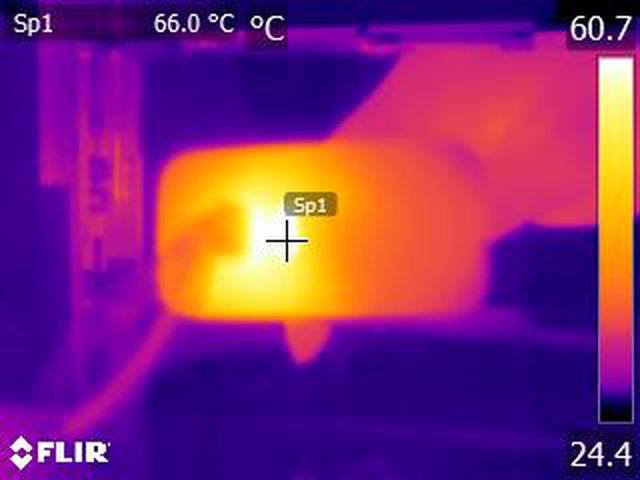 ▼充電器模式下於電池完全充飽時USB-C1連續輸出20V/2.3A一小時後本體的紅外線熱影像