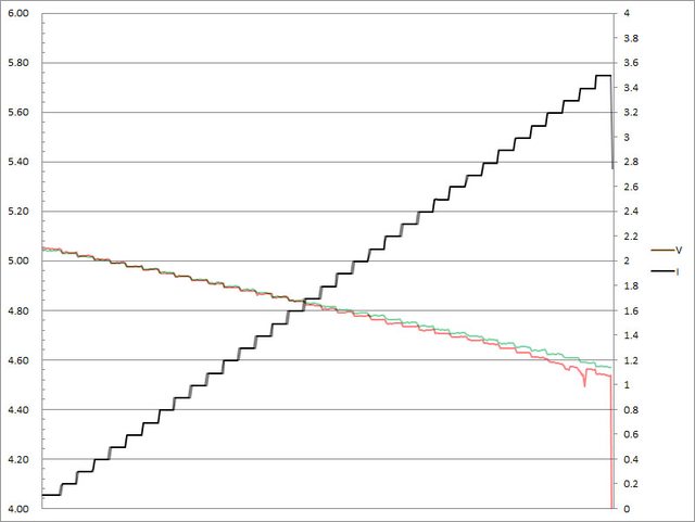 ▼行動電源模式下USB-C1(紅)/USB-C2(綠)的固定檔5V輸出負載測試,隨著電流增加,輸