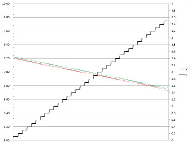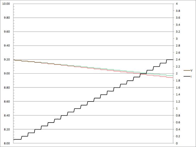 ▼行動電源模式下USB-C1(紅)/USB-C2(綠)的固定檔9V輸出負載測試,隨著電流增加,輸