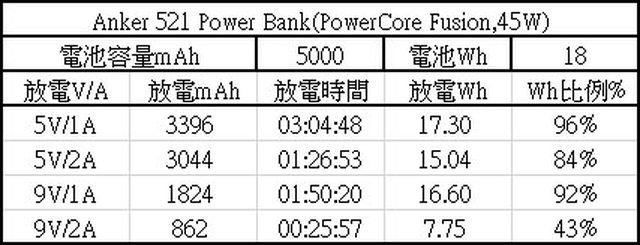 ◆行動電源模式下5V/1A及5V/2A均超過規格標示的額定電容量,5V/1A可用Wh比例達96%,