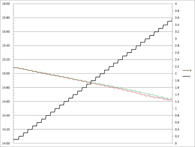 ▼充電器模式下USB-C1(紅)/USB-C2(綠)的固定檔15V輸出負載測試,隨著電流增加,輸出