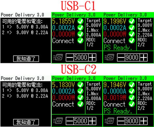 ▼行動電源模式下USB-C1/USB-C2單獨使用時,固定檔提供5V/3A、9V/2.22A
