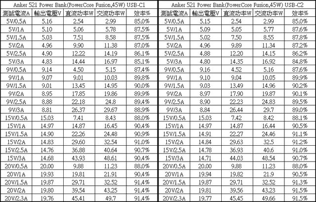▼充電器模式下於電池完全充飽時USB-C1(左)/USB-C2(右)單獨輸出的各組輸出轉換效率