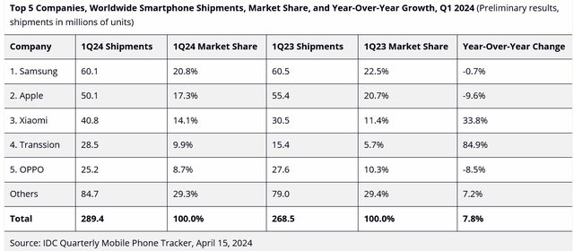 https://www.idc.com/getdoc.jsp?containerId=prUS52032524 Samsung 20.8% Apple 17.3% Xiaomi 14.1% Transsion 9.9% OPPO 8.7% others 29.3% 小米在中國國內有華為的競爭,在國際上要面對蘋果和三星, 雷軍的觀點跟把目光放在ptt之類的匿名管道或是用fb weibo看世界的人, 顯然是不一樣。中國網軍(水軍)再怎麼洗,還是無法反映真實世界。 -- ※ 發信站: 批踢踢實業坊(www.ptt.org.tw), 來自: 223.140.203.1 (臺灣) ※ 文章網址: https://www.ptt.org.tw/MobileComm/M.1717141612.A.859