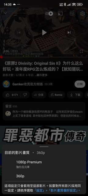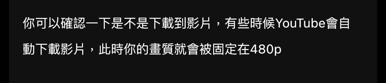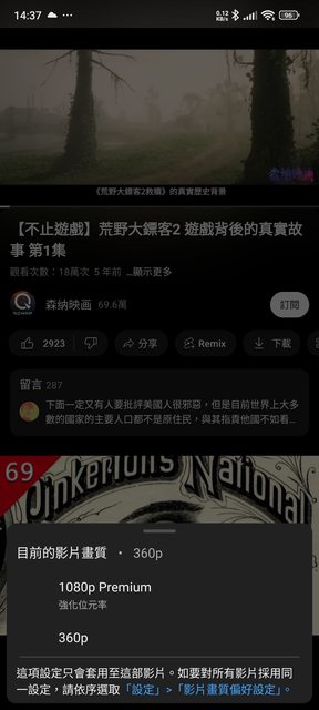 手機是Android手機 用Youtube官方APP撥放 Google play用自動更新 Youtube app基本上都是比較新或最新的版本 最近大概一個多月內發現少數某些Youtube影片只能看360p (那部是有1080p的影片但不能開上去) 影片畫質選項只有低畫質360p或訂閱1080p Premium https://i.imgur.com/NZvoD7o.jpg