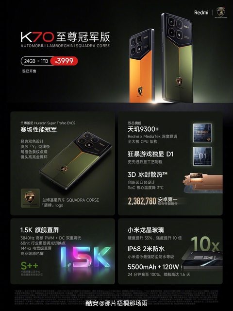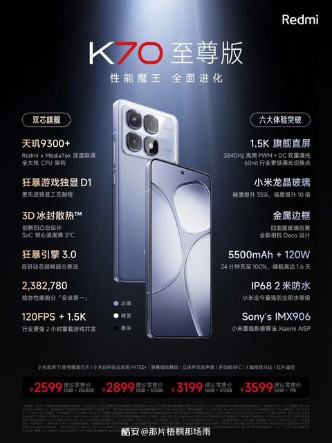 12G+256GB 5999人民幣 約 27K台幣 12G+512GB 6499人民幣 約 29K台幣 16G+1TB 7,299人民幣 約 33K台幣 第三代驍龍8 處理器 螢幕 - 6.86吋 內螢幕 - 1-120Hz LTPO更新率 - 4.01吋 外螢幕 - 1.5K解析度/120Hz LTPS更新率 3000nit 局部峰值亮度/龍晶玻璃 相機 - 50MP 主攝 光影獵人800 OIS - 50MP 人像長焦距 OV60A OIS - 32MP 前置 OV16F40 電池 - 4780mAh電池/67W有線充電 - 0809 X軸線性馬達 - 紅外線遙控/NFC/雙揚聲器 其他 - 重192公克 - 厚15.99mm/折疊 - 167.5×74.02mm×7.8mm/展開 Redmi K70 至尊版 http://i.imgur.com/Csk5NkA.jpg
