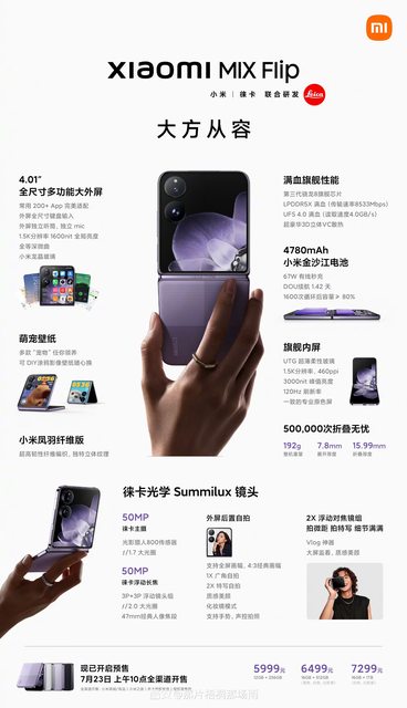 12G+256GB8999人民幣 約 40K台幣 16G+512GB9999人民幣 約 45K台幣 16G+1TB10999人民幣 約 50K台幣 第三代驍龍8 處理器 螢幕 - 7.98吋 內螢幕 - 1-120Hz LTPO更新率 - 6.56吋 四微曲外螢幕 - 1-120Hz LTPO更新率 相機 - 50MP 主攝 光影獵人800 OIS - 12MP 超廣角 OV13B - 50MP 人像長焦距 OV60A OIS - 10MP 潛望長焦 S5K3K1 OIS - 20MP 內螢幕前置- 20MP 外螢幕前置 電池 - 5100mAh電池/67W有線充電 - 50W無線充電 其他 - 0815E X軸馬達 - IPX8等級防水 - 全碳架構/三層五面立體主機板 - 支援天通衛星雙向通訊 - USB 3.2 Gen1 - 重226公克 159.37×143.3mm×4.59mm/展開 159.37×73.1mm×9.47mm/折疊 小米MIX Flip http://i.imgur.com/SSMF4aQ.jpg