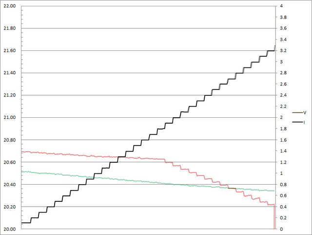 流超過3.2A截止;電流增加時C2輸出電壓下降,電流超過3.2A截止