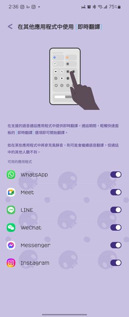 翻譯功能目前有兩種 通話翻譯 跟 語音翻譯 看影片全局翻譯應該只能用GOOGLE的即時字幕方案(應該叫這個) 0726更 聽你這麼一說 我去找真的有欸 一樣預設關閉 ...... 這功能不應該主打嗎 這年頭幾乎都APP通話了 https://i.imgur.com/zuzqlyo.jpeg
