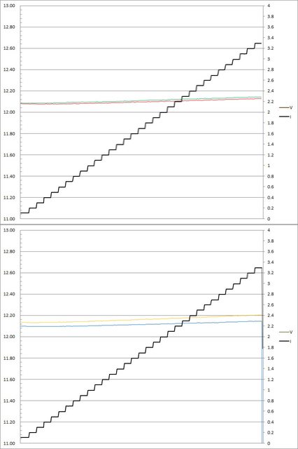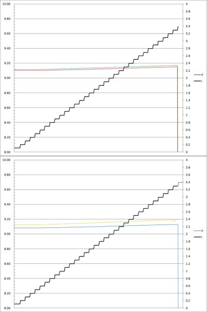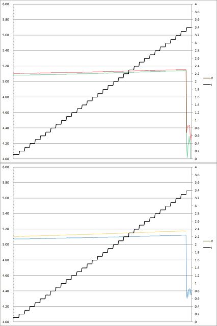 輸出電壓上升,輸出電流超過3.3A(C1/C2/C3)大幅壓降,超過3.4A(C1/C2/C3)/3.3A(C4)