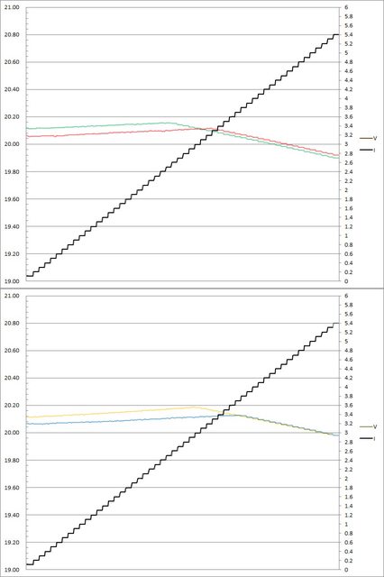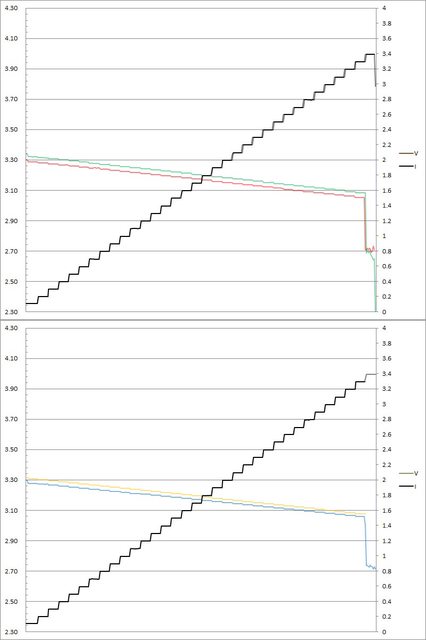 輸出電壓上升,輸出電流超過3.3A(C3)大幅壓降,超過3.4A(C3)/3.3A(C1/C2/C4)截止
