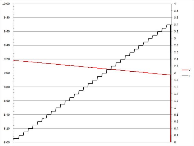 ▼USB-C埠固定檔9V輸出負載測試,電流增加時輸出電壓下降,電流超過3.4A截止