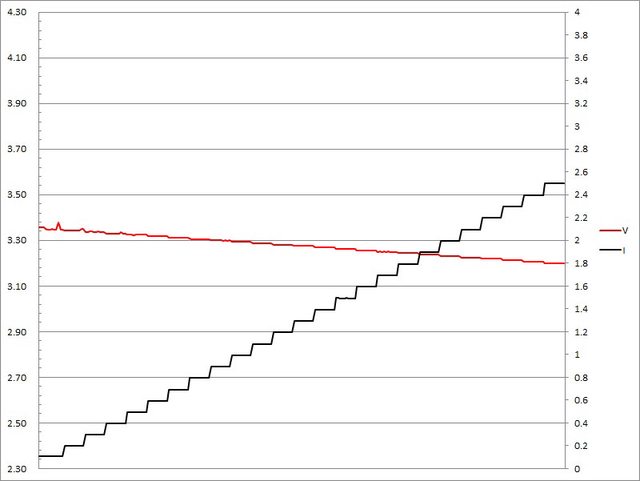 ▼USB-C埠第二組PPS檔3.3V輸出負載測試,電流增加時輸出電壓下降,電流超過2.5A截止