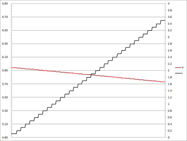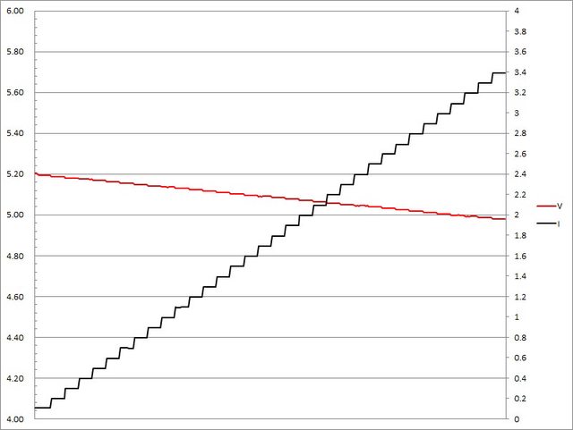▼USB-C埠固定檔5V輸出負載測試,電流增加時輸出電壓下降,電流超過3.4A截止