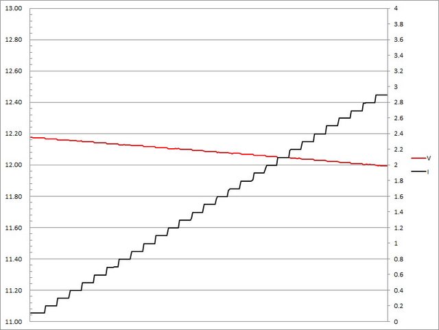 ▼USB-C埠固定檔12V輸出負載測試,電流增加時輸出電壓下降,電流超過2.9A截止