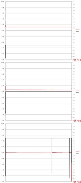 ▼USB-C埠9V/1A、9V/2A、9V/3A放電的電壓電流圖表如下所示,9V/3A放電3次才能完全放