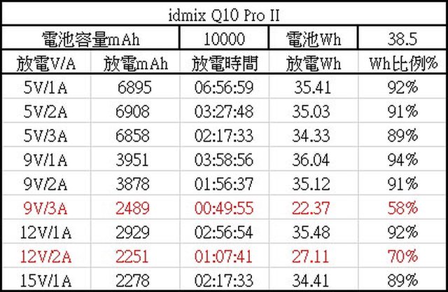 超過規格標示額定容量6160mAh,可用Wh比例最高94%(9V/1A),不過9V/3A及12V/2A放電時