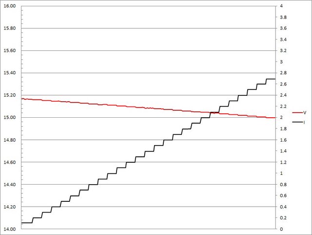 ▼USB-C埠固定檔15V輸出負載測試,電流增加時輸出電壓下降,電流超過2.7A截止