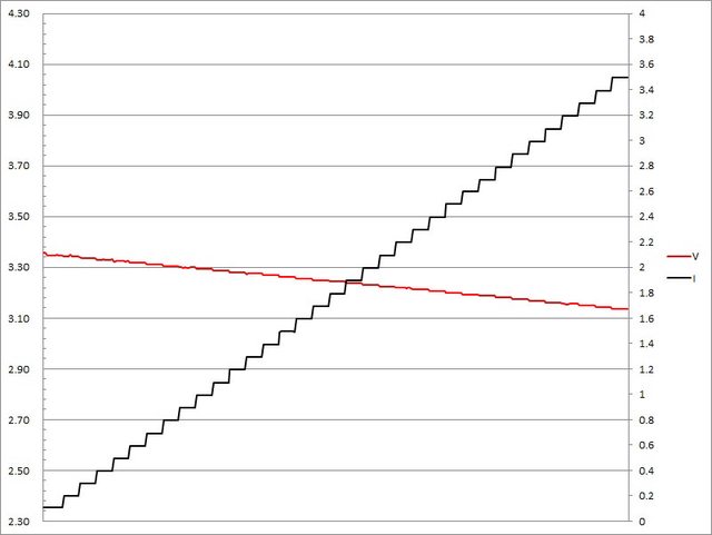 ▼USB-C埠第一組PPS檔3.3V輸出負載測試,電流增加時輸出電壓下降,電流超過3.5A截止