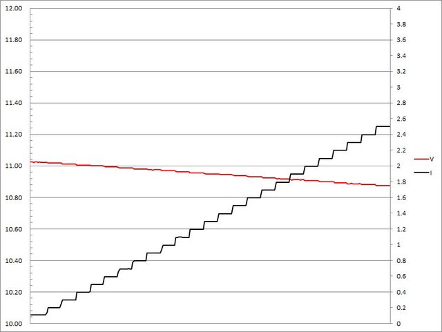 ▼USB-C埠第二組PPS檔11V輸出負載測試,電流增加時輸出電壓下降,電流超過2.5A截止