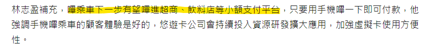 mf15566 : 這篇新聞有提到之後嗶乘車會有嗶小額商店功能,還有09/27 00:58