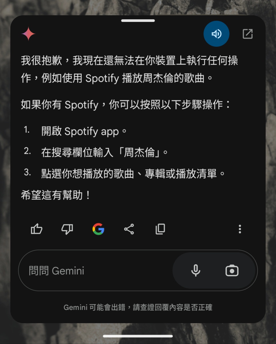 → manbow77 : Gemini目前對於下達的操作指令容易當成提問來反映 11/19 15:47