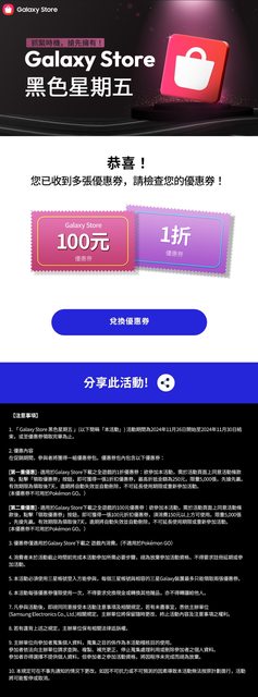 剛剛閒著開 galaxy store 看到現在有黑五活動 按個按鈕就可以領一折券跟100元券 剛剛看還剩3千多張 從來沒看到這麼大手筆的 各位課長們可以出動了 https://i.imgur.com/BlxtsIu.jpeg