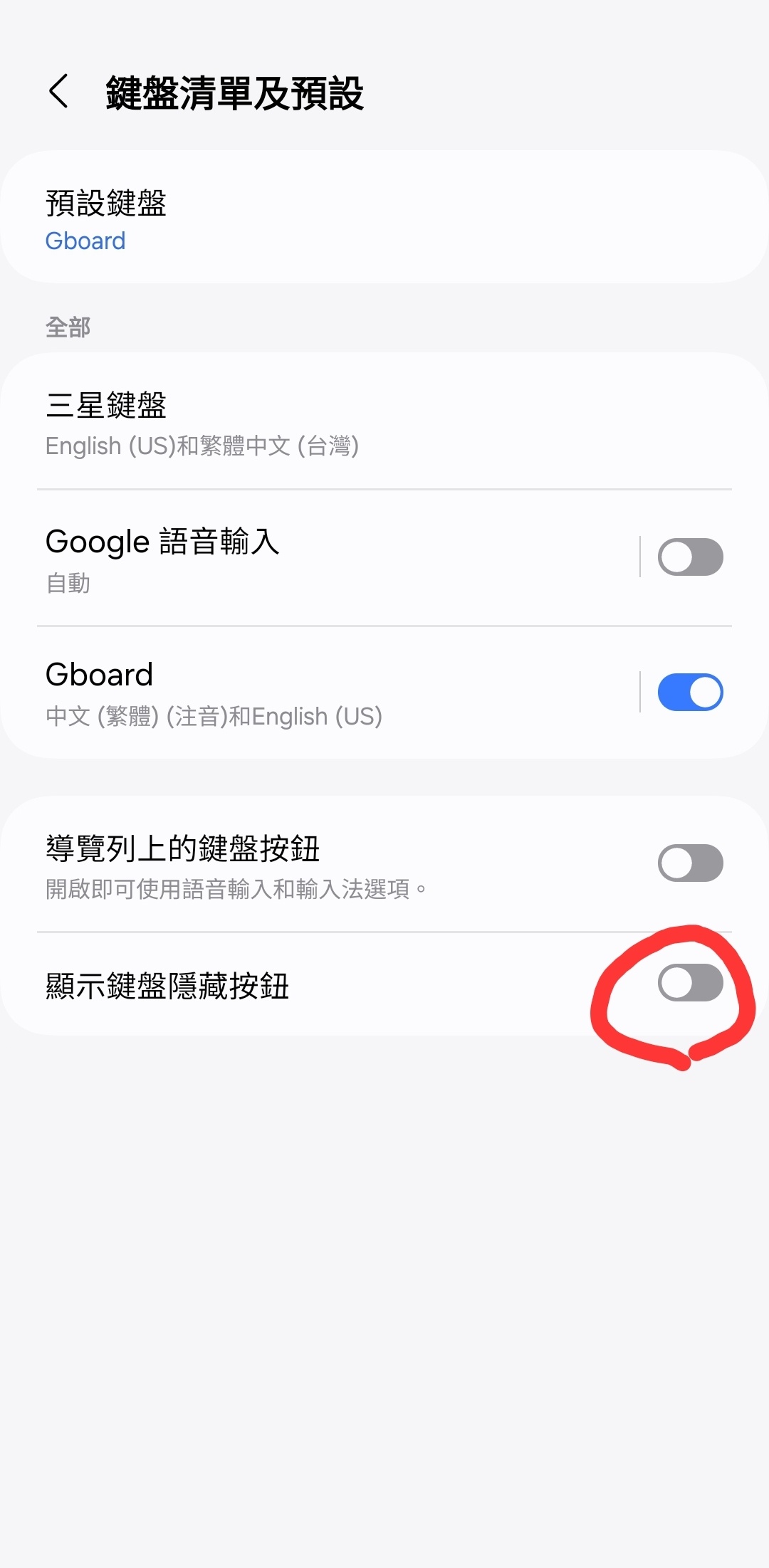 推 timh3316 : 設定>一般管理>鍵盤清單及預設>顯示鍵盤隱藏按鈕關12/05 13:33