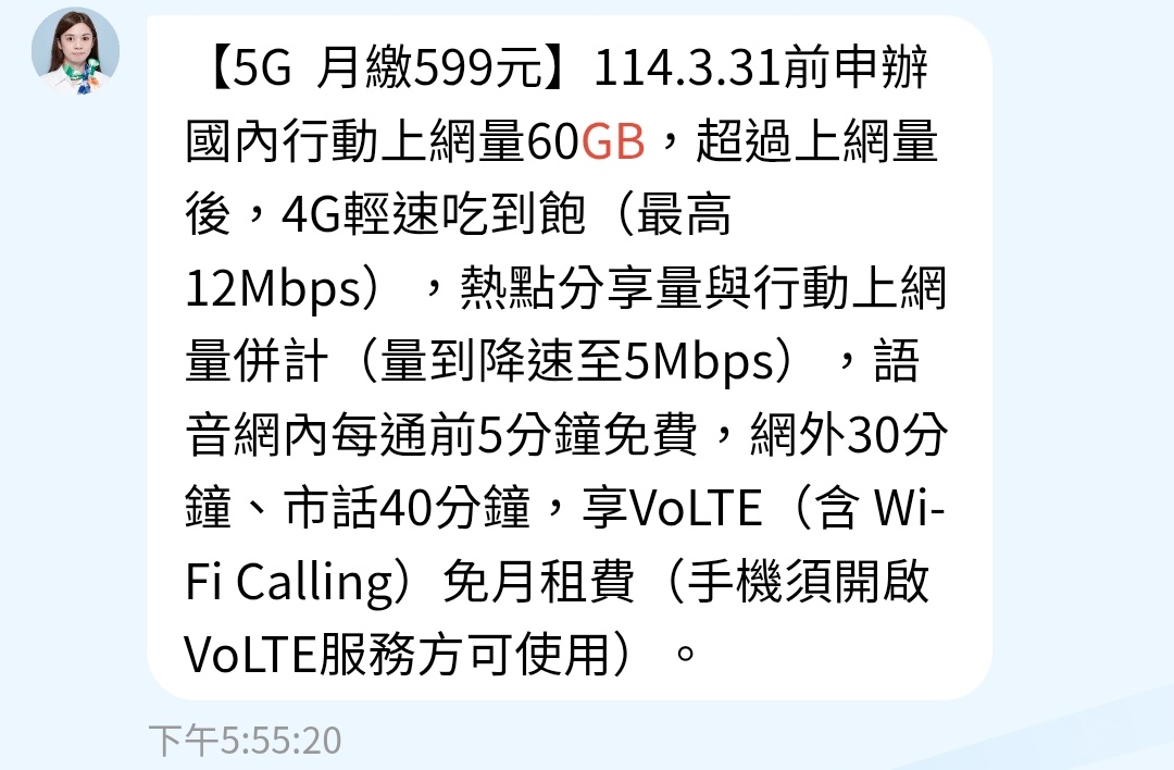 推 s7165s7165 : 剛剛問文字客服,得到下面方案:月繳599元,綁24/3 03/24 17:29