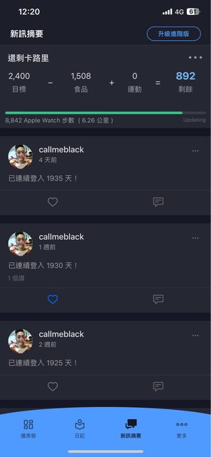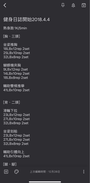 除了記事本紀錄外,我覺得Apple Watch 也是很好的紀錄,而且手錶會一直逼你強度再加 強。 修正計畫當然也要包含飲食,我也是習慣用app每天紀錄。 https://i.imgur.com/ZMZpgUP.jpg