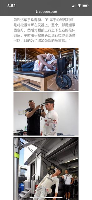 最近看影片發現F1賽車手 因為過彎時的向心力+頭盔很重 所以要特別練頸部肌肉 他們的脖子都超粗的 https://i.imgur.com/c5TtR7g.jpg